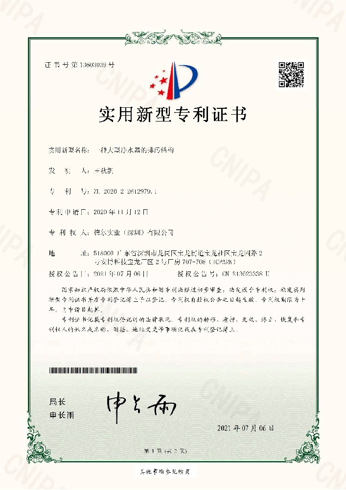 7. 凈水器排污結(jié)構(gòu)實(shí)用新型專利證書