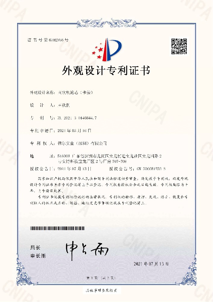 2. 直飲機(jī)濾芯(卡接)外觀設(shè)計(jì)專利證書